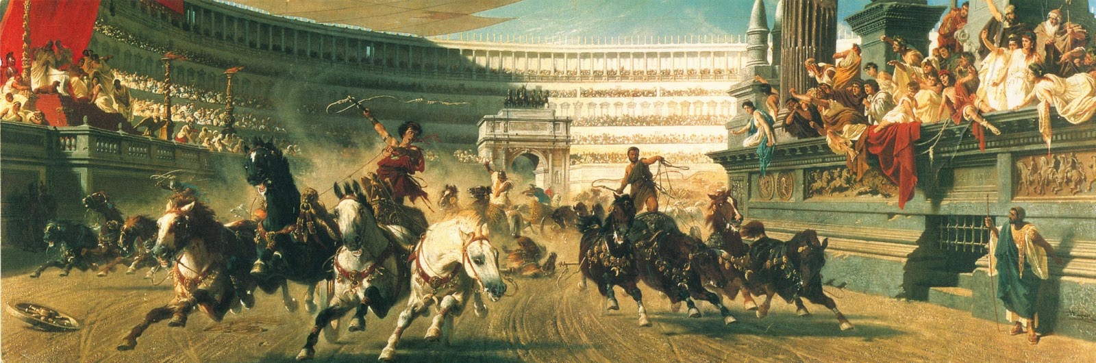 Chariot Race, which was completed in 1890. It is an oil on canvas painting. I saw this picture as a great depiction of movement. Wagner did an excellent job capturing the movement of this "chariot race". He created this reality to the picture and it looks as though someone took a picture of the race itself. This painting was one of his most famous works. If you look closely in the picture Wagner also created the loss of a wheel from the chariot during the race. This makes a story out of the painting.